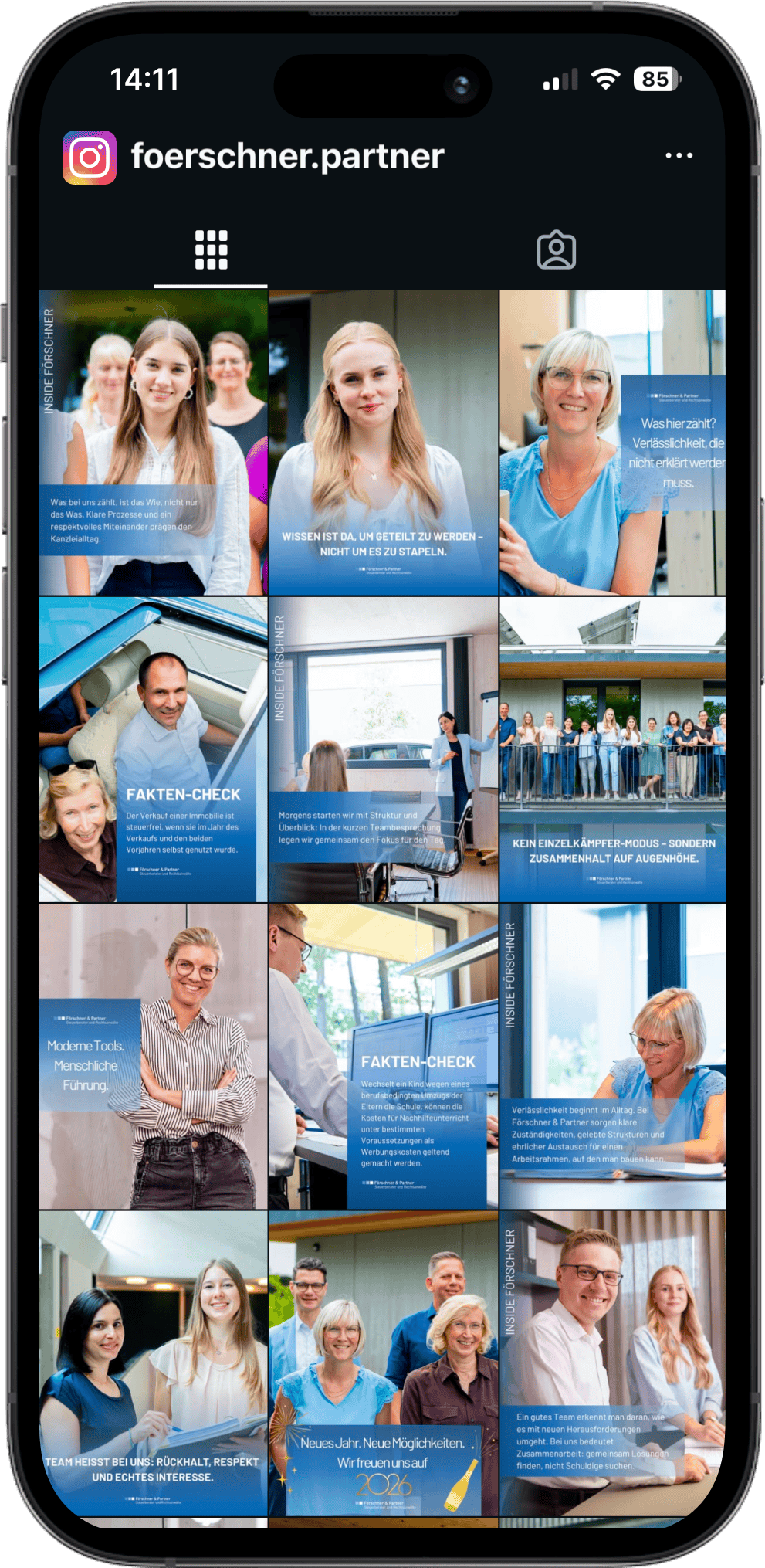 Ihr Auftreten wird durch professionelle Foto- und Videoaufnahmen lebendig. Wir übernehmen Ihre Social Media-Präsenz vollständig mit strategischem Content-Aufbau.
